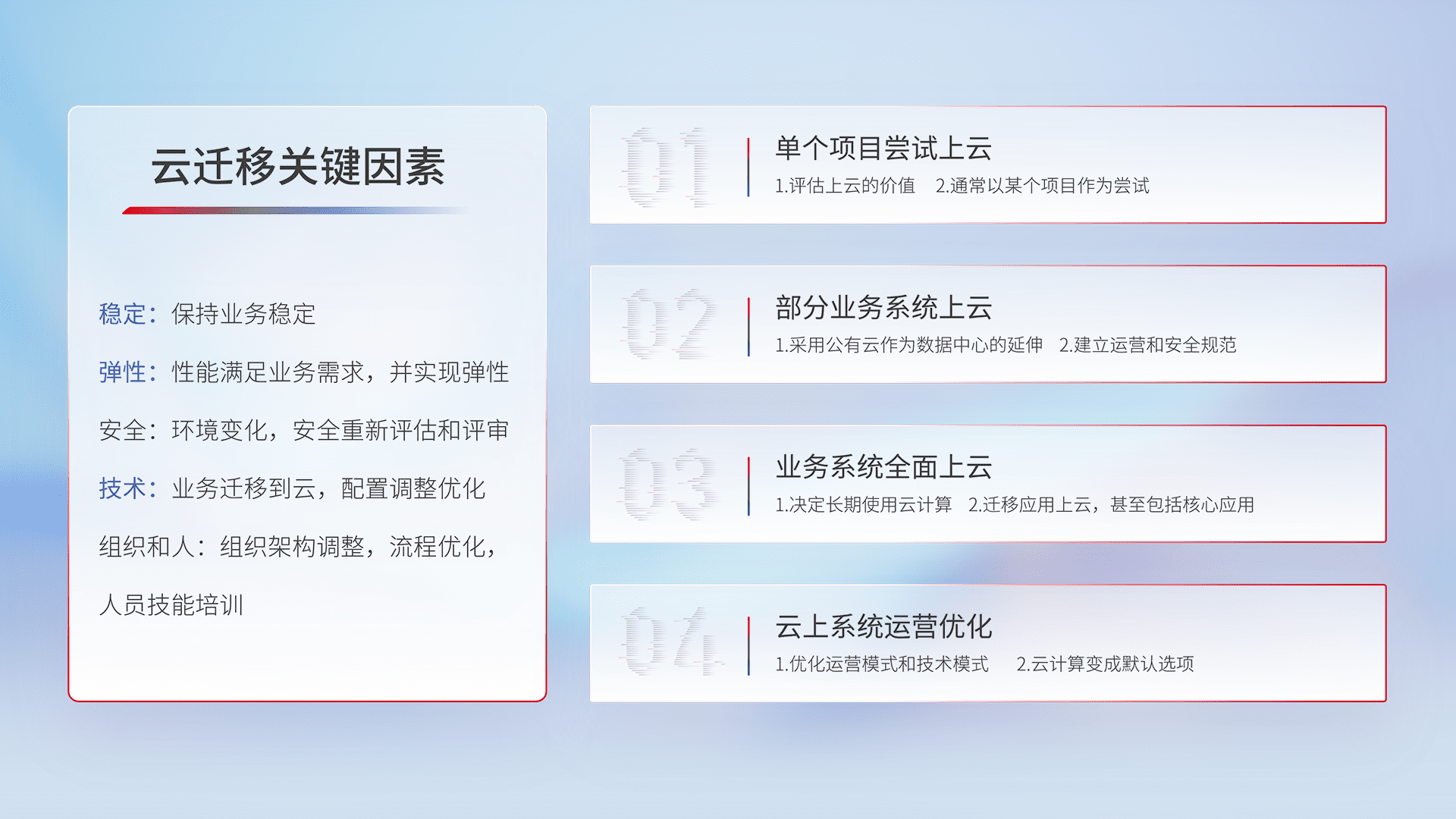 结合实际业务,,从规划设计、、、、云平台选型、、、云原生改造、、、、数据迁移、、集成交付,,迁移全过程为客户识别最佳上云路径,,做好风险识别管理,,,,设计网络架构、、、、身份权限、、、安全审计合规、、、操作审计、、、、日志审计、、、监控告警策略、、、多站点容灾设计等,,对云上基础设施进行整体规划,,,,提升IT治理水平,,,,以满足弹性、、高可用、、、高性能的需求。。。