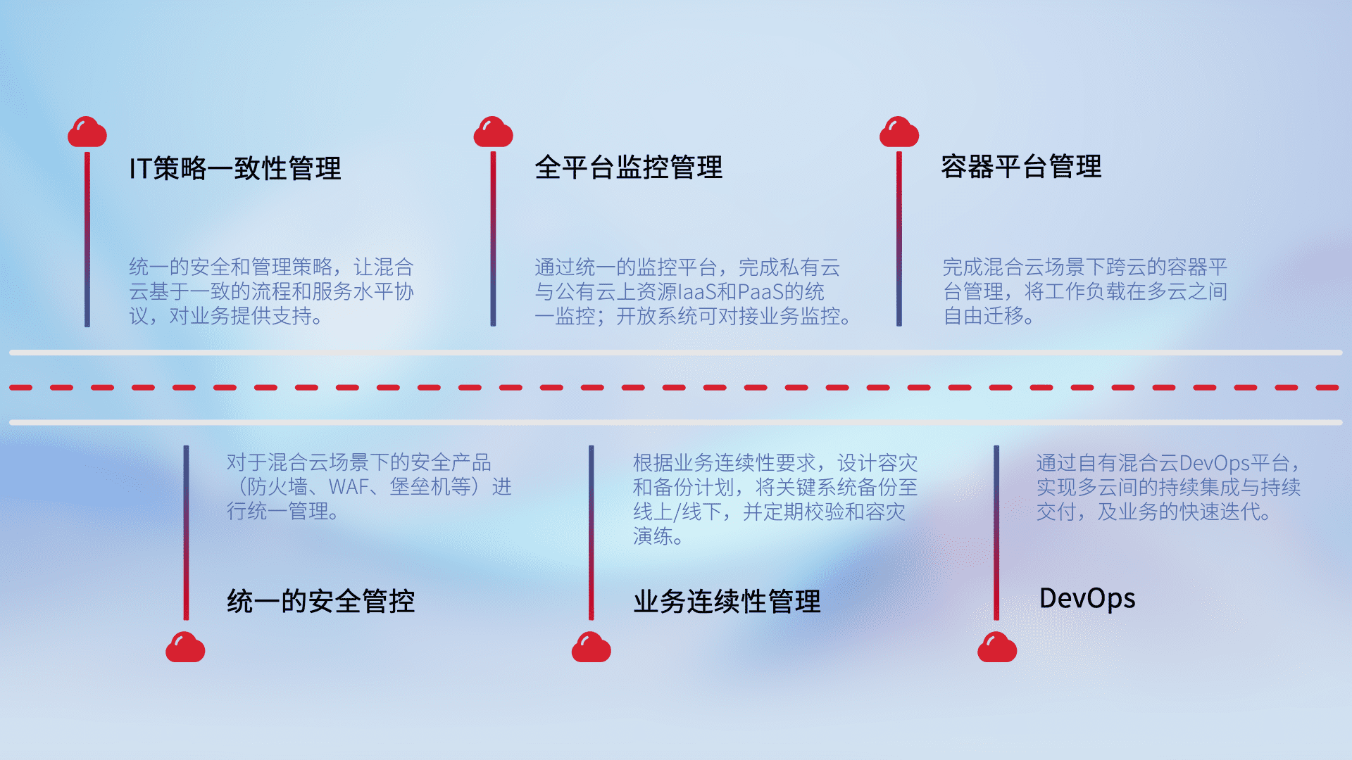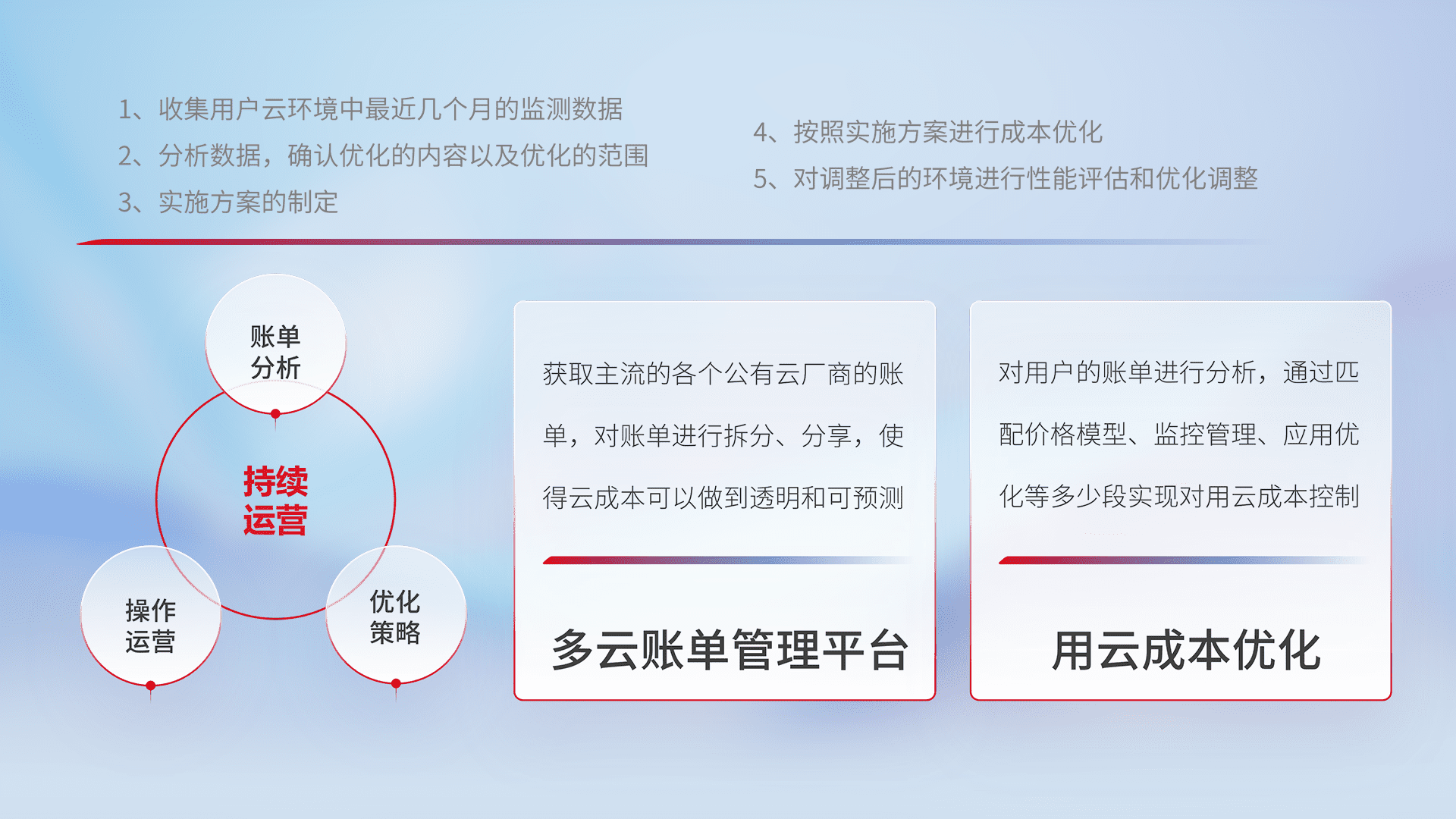 通过多云纳管,,,,以统一的资源数据模型把客户的云资源进行抽象和封装,,,进而实现对多云资源的统一操作,,,,保障云资源管理的可靠性、、稳定性与可用性。。。量身定制化运维内容,,配置、、、、开发运维、、、补丁管理、、、、备份、、监控、、、认证和访问管理、、、、审计和日常巡检等,,保障在用云过程中的可靠度,,稳定度以及高可用率。。。。